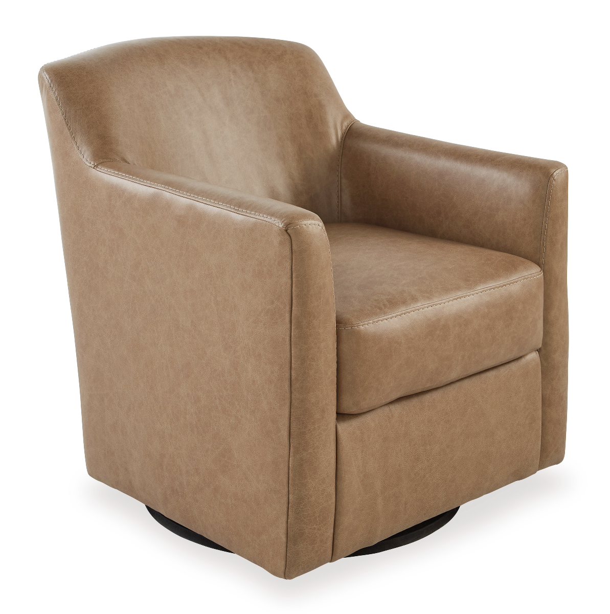 Accent chair. Shelter arm. Leather match upholstery in tumbleweed. Tight back and loose, non-reversible seat cushion. Metal swivel base. Coordinating stationary group 57302.Read More