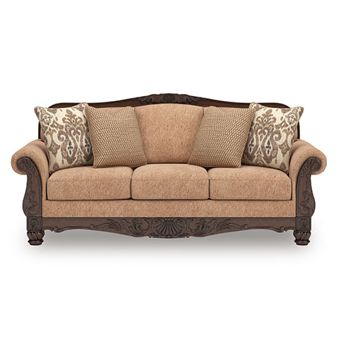 This sofa is a gorgeous example of new traditional design. Its elegant profile and plush cushions merge classic flair with modern comfort. Golden high-luster textured upholstery sets the tone for an easy elegant look, while carved details and decorative turned legs make a grand statement.Read More
